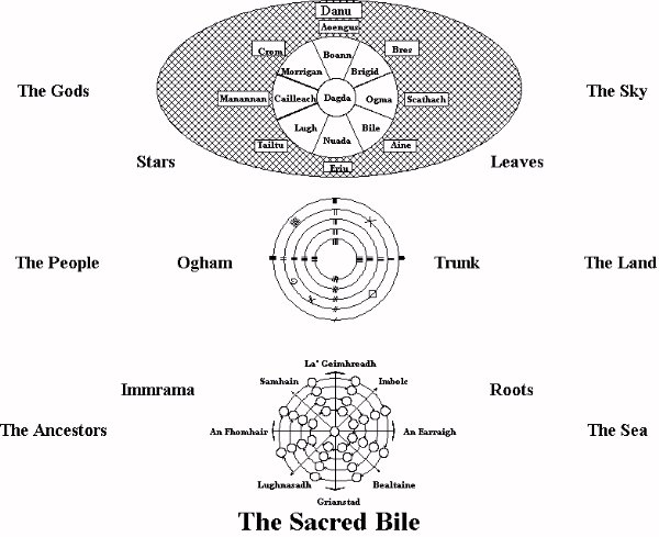 upon the stones of the Brugh itself The Three Worlds of Land, Sea and Sky To the Celts (and the Druids), the Cosmos consisted of the Three Worlds. These worlds are the Skyworld of the Gods, The Middleworld of the Earth and the Underworld of the Spirits and Ancestors. These Three Worlds were interconnected by the Crann Bethadh ("Tree of Life") or the Sacred Bíle. Flows of Spirit, Fire and Water, moved through the many levels of this Cosmos, constantly going from one realm to another in cycles of birth, death and rebirth. The secrets of the Tree of Life are contained within the Ogham (which represent the Wood Wisdom of the Forest) and its many "keys of knowledge". The Brugh na Bóinne "O nobles of Breg, a might that is
